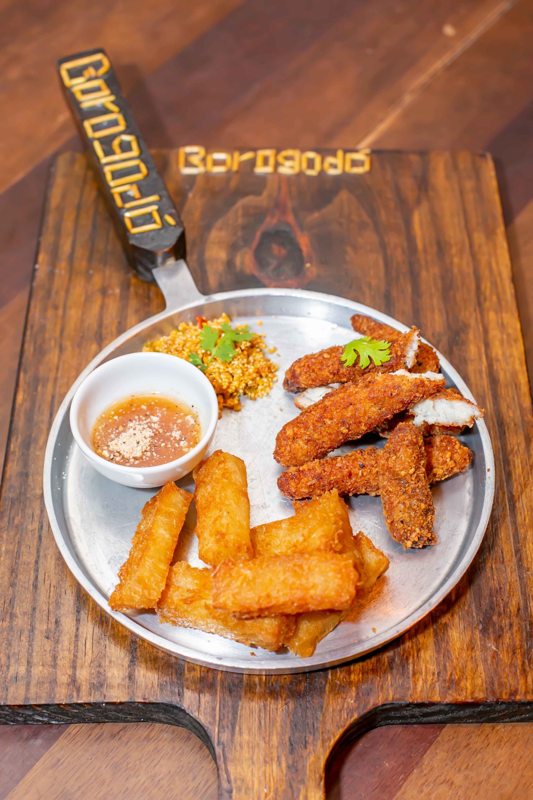 Petisco: Filé de Tilápia ao molho de Camarão com macaxeira frita ou cozida