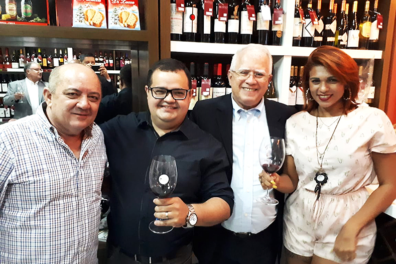 | O empresário Luiz Pedro Fernandes (segunda da esquerda para direita) recebeu um grupo de convidados para o lançamento dos vinhos |