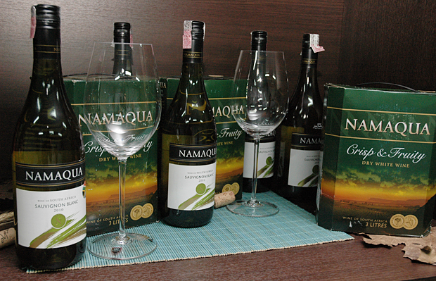 | Vinho branco Namaqua pode ser adquirido em caixa de 3 litros, tornando-se mais prático para viagem e sendo conservado por vários dias |