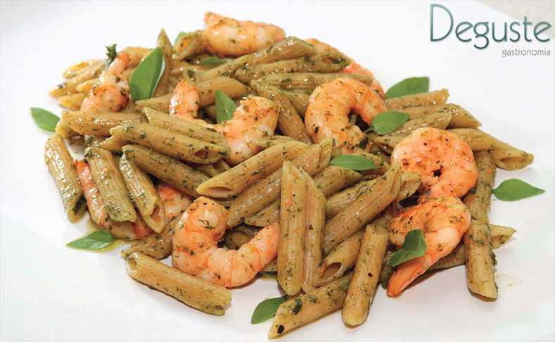 Penne integral de camarão ao molho pesto