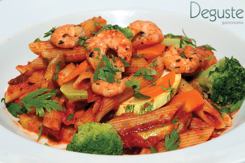 | Penne mar e monte, com camarão e juliene de legumes no molho de tomate |