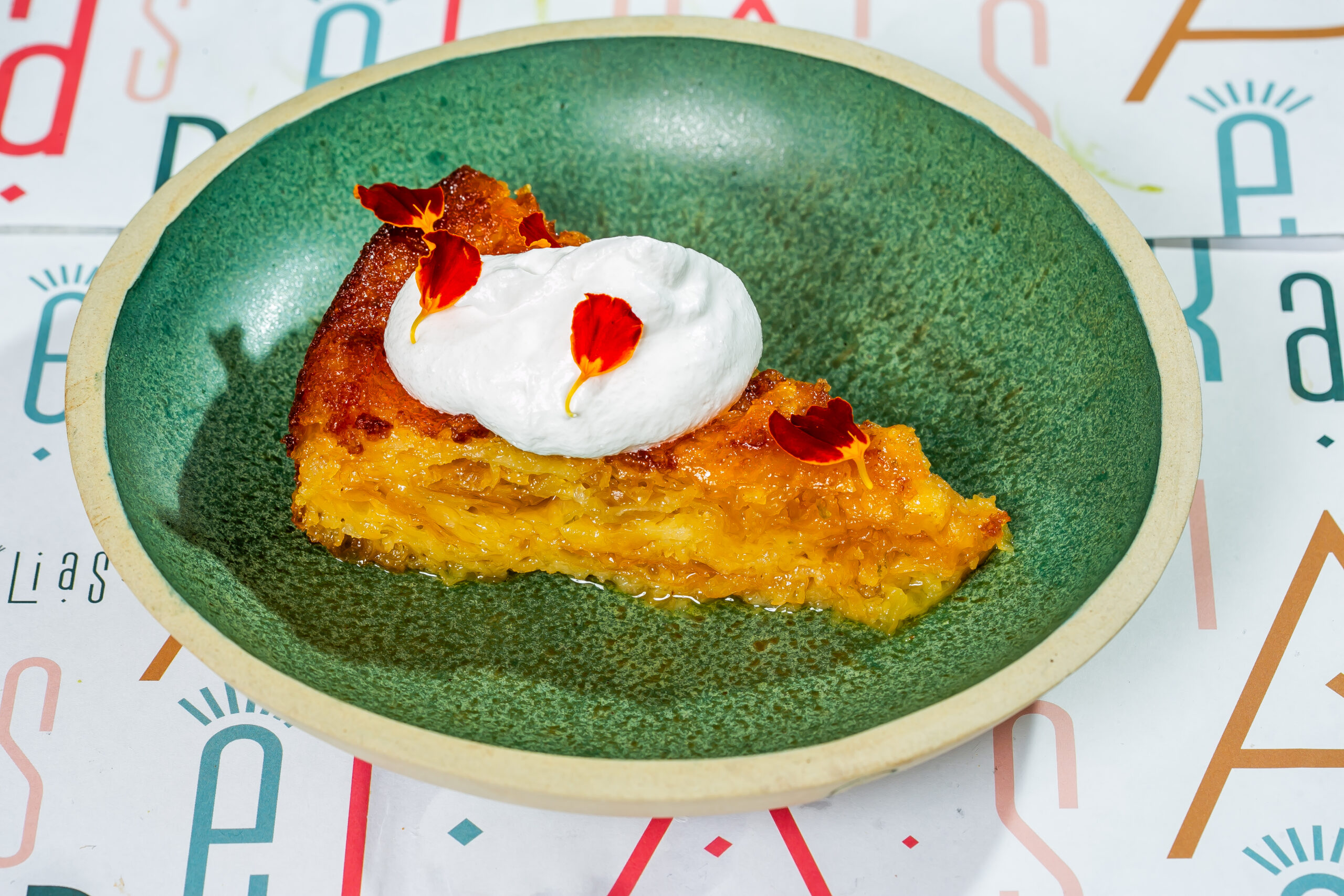Bolo Grego é feito com iogurte grego e delicadas fatias de massa filo, embebido em calda de laranja e especiarias