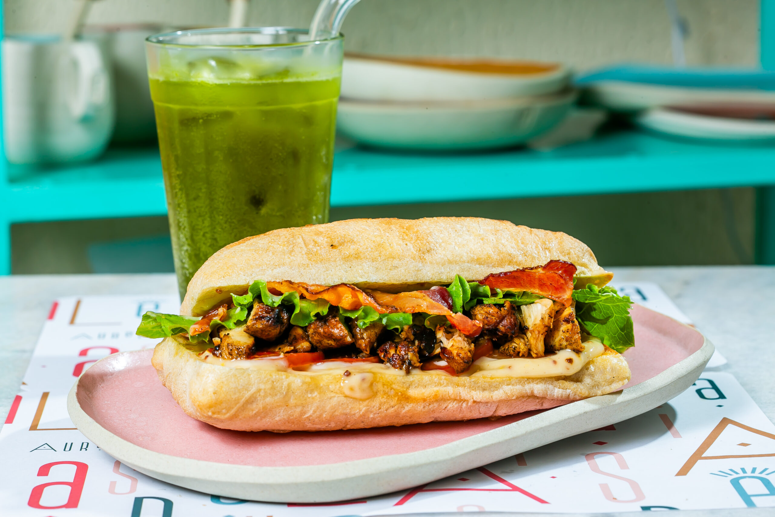 Club Sandwich é feito com pão ciabatta, frango marinado, bacon e maionese de vinagre de framboesa