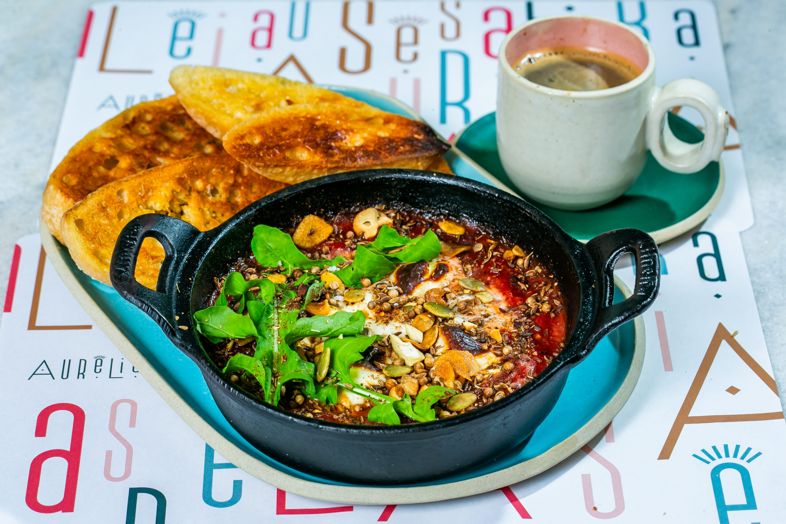 Shakshuka é um molho rústico de tomate com berinjelas douradas, ovo caipira e creme de ricota com pão de fermentação natural