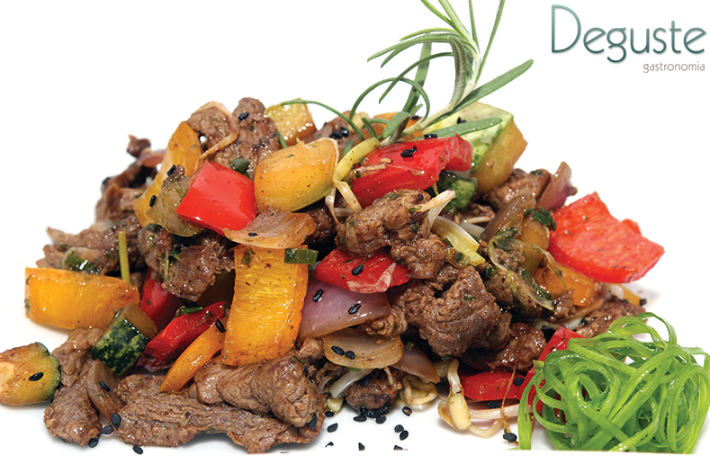 | Wok de filé, abobrinha, cebola, pimentão colorido e broto de feijão nirá |