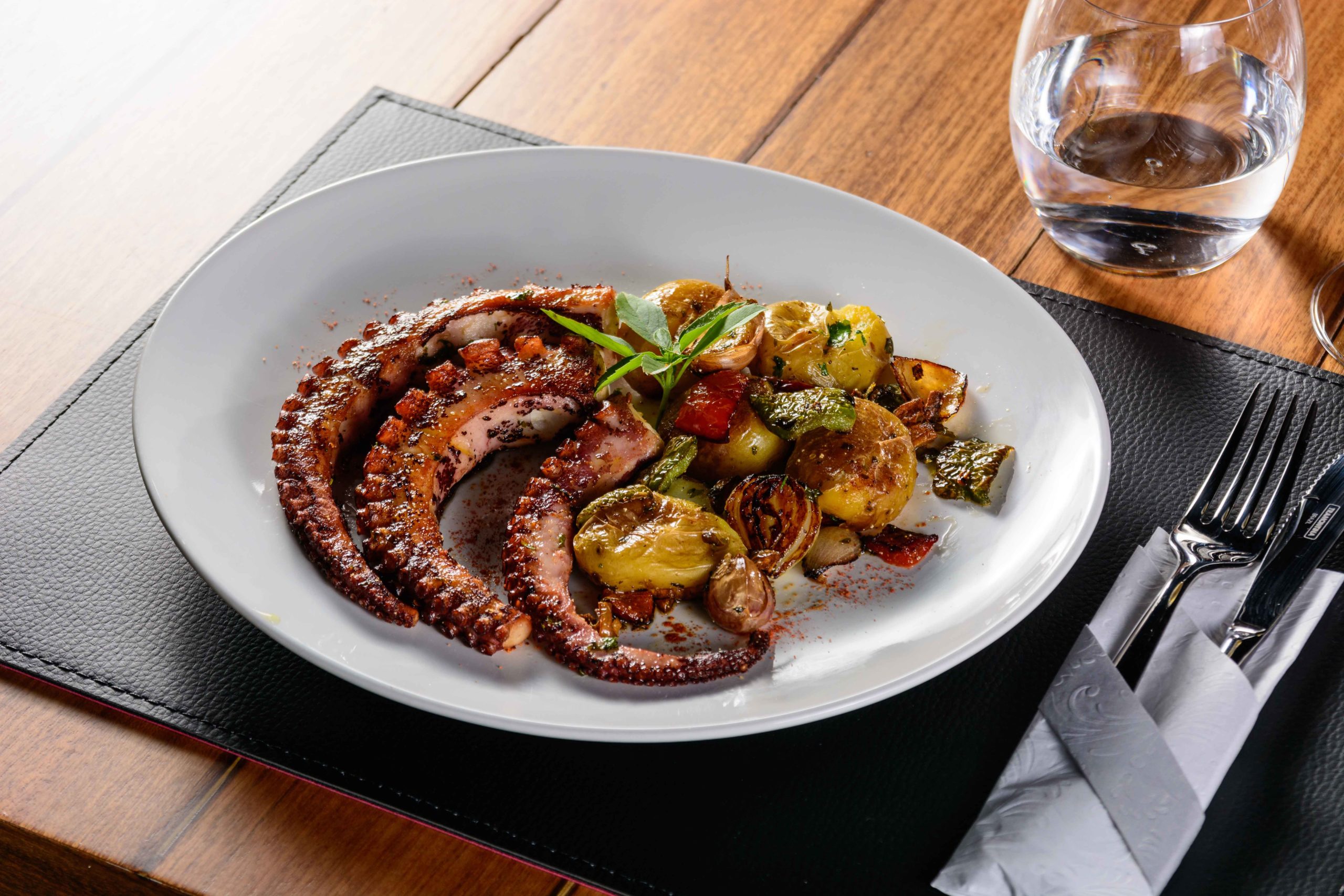 Ainda do menu degustação, o cliente pode escolher como entrada o Polvo ao vinagrete ou mais três opções. Boa opção de prato principal é o Filé mignon ao molho marchand de vin. Entre as sobremesas, destaca-se o Folhado de Brie e damasco.