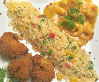 O primeiro prato é o Gamberi Passione, com camarão flambado ao vinho branco com mussarela, açafrão e molho bechamel, guarnecido com arroz piamontese. O segundo é o Gamberi alla Moda Bigi, também com camarão, mas desta vez flambado ao molho de maracujá, acompanhado com arroz primavera e brócolis a dorê.