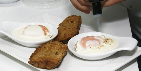 | Huevos a Nueva Cruz, ovos de galinha do pescoço pelado com requeijão sobre pão rústico |