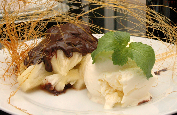 "Pedia-se muito sobremesa de abacaxi, mas inovamos no sabor e acrescentamos chocolate com um toque de pimenta e sorvete", explica a chef Eli. A união de sabores provoca sensações inusitadas. O cítrico do abacaxi é quebrado com o doce apimentado do chocolate e o sorvete oferece o frescor para arrematar a sobremesa.
