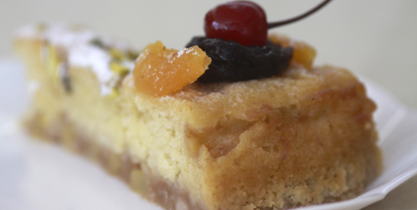 | Bolo Francês à base de compota de banana, maçã e morango |
