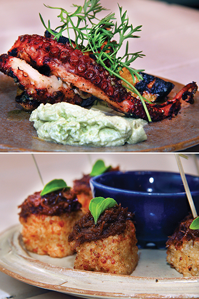 | Acima: Polvo grelhado com batatas e aioli e Cubinhos de tapioca | Camarão empanado |