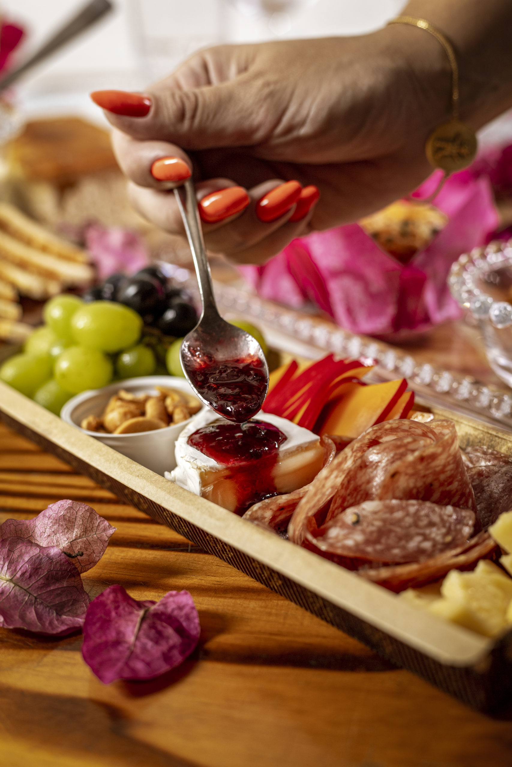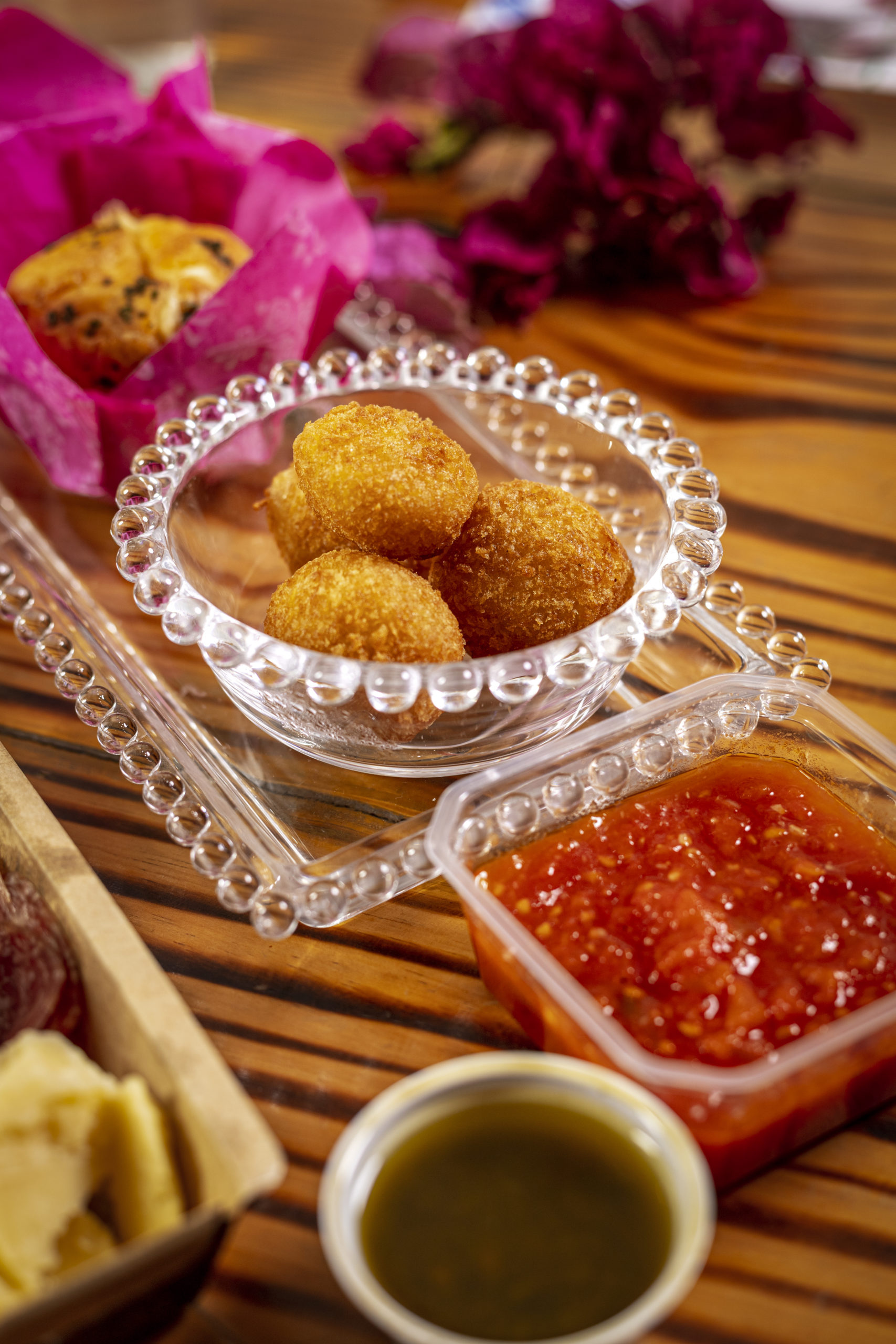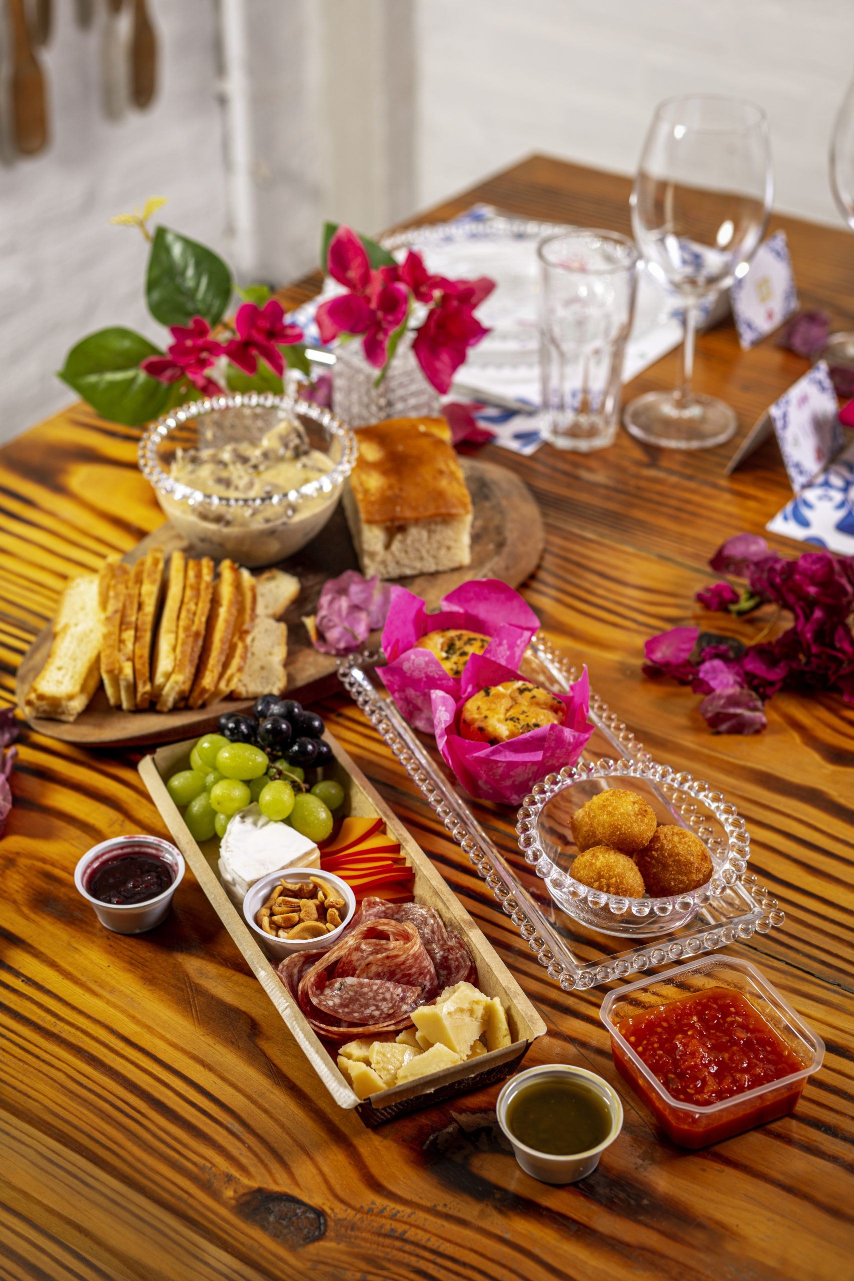 A caixa inclui, no primeiro passo, um box couvert de entradas com lascas de parmesão, queijo do reino, Brie com redução de frutas vermelhas, salame, castanhas, uvas e azeitonas, seguida de crocante com mozzarella italiana caprese acompanhando uma focaccia e um filezinho ao gorgonzola.