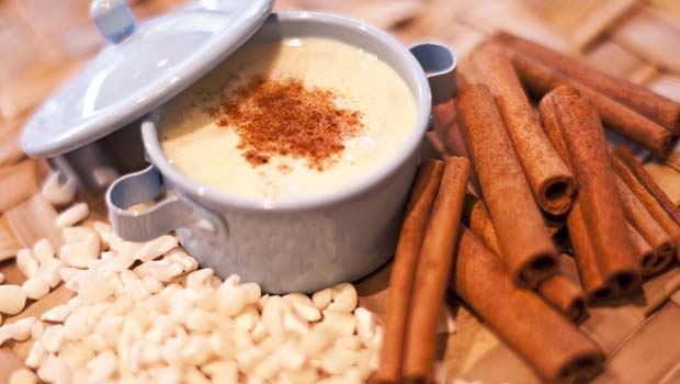 | Canjica é servida quentinha com pó de canela numa panelinha de ágata |
