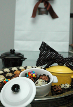 | Os brigadeiros são embalados em bonitas panelinhas de cerâmica |