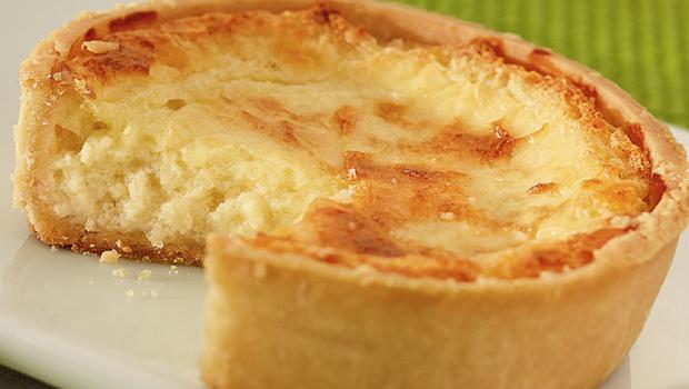 | Quiche à base de massa assada recheada com queijo e requeijão |