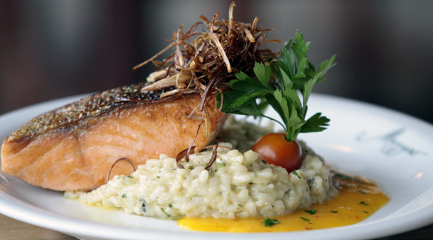 | Badejo defumado com bacon, purê de maçã e farofa de frutas frescas foi o prato principal servido no jantar do Chef’s |