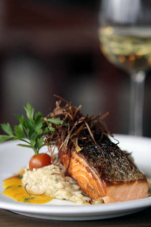 | Salmão grelhado com risoto de gorgonzola e chutney de manga |