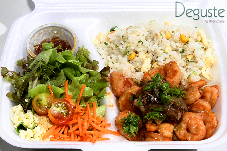 O cardápio do Cherry Blossoms é composto de três proteínas (frango, camarão e carne) que podem ser combinadas apenas com salada ou também com arroz no vapor ou frito. Também há pratos especiais. Na visita que a DEGUSTE fez ao local, havia um Kakuni (carne de porco cozida) com arroz e salada. O Teppan Camarão e o Katsu-Kare, com carne à milanesa e molho curry, também eram destaque no dia e estão no menu fixo. Além disso, batatas fritas no palito chamavam atenção pelo sabor e apresentação.