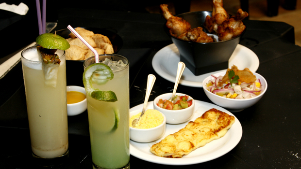 | Algumas delícias da casa: o ceviche, a coxinha de asa de frango e as caipifrutas |