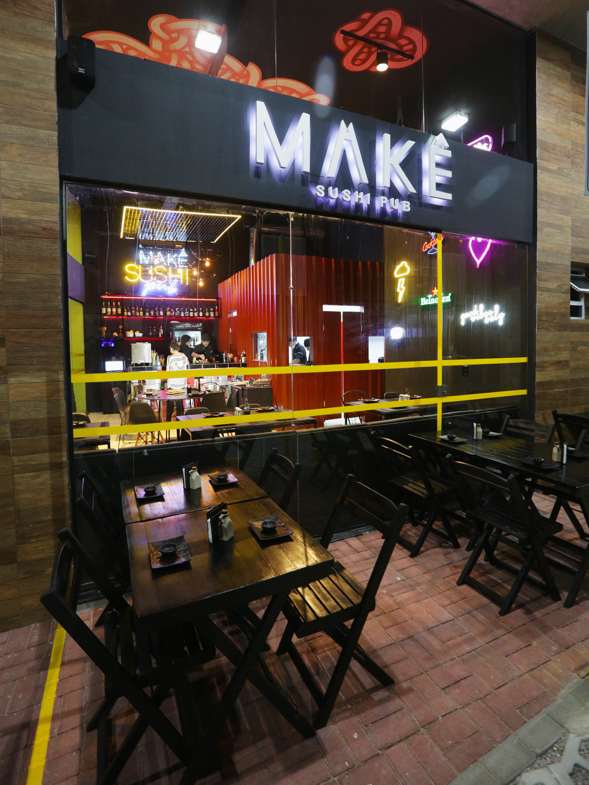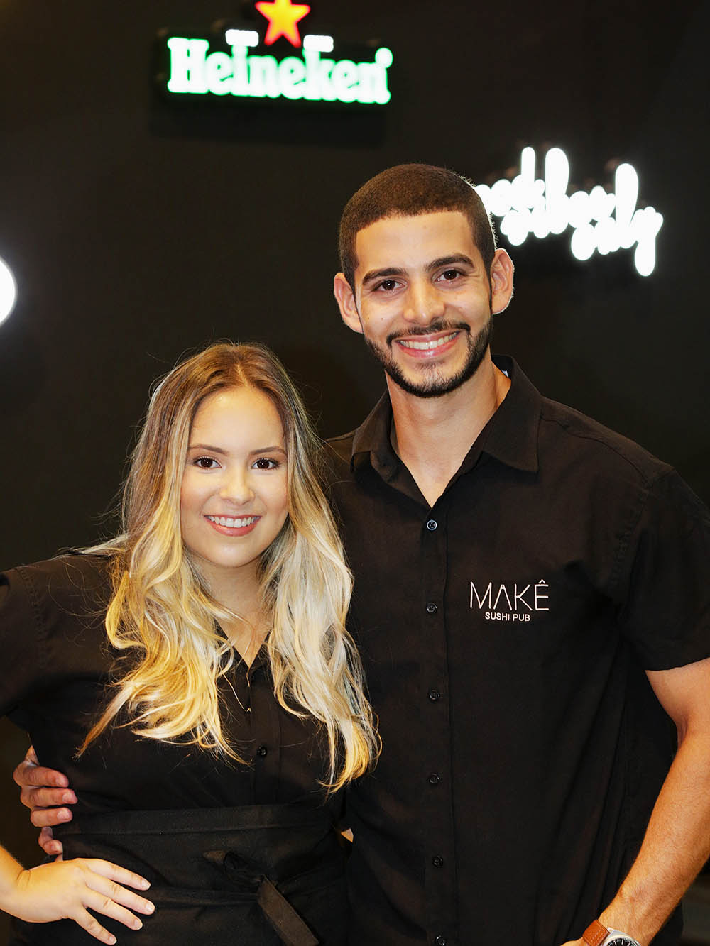 Os donos do Makê Sushi Pub são os noivos e empresários Marina Araújo e Klésio Brito. A ideia é manter um ambiente contemporâneo, com referências industriais e grafite do artista Kefren Pok no teto preto. O espaço tem decoração assinada pelo Studio C Arquitetura. O lugar acomoda 42 pessoas, com mesas do lado de fora e logo ganhará um pequeno decky.