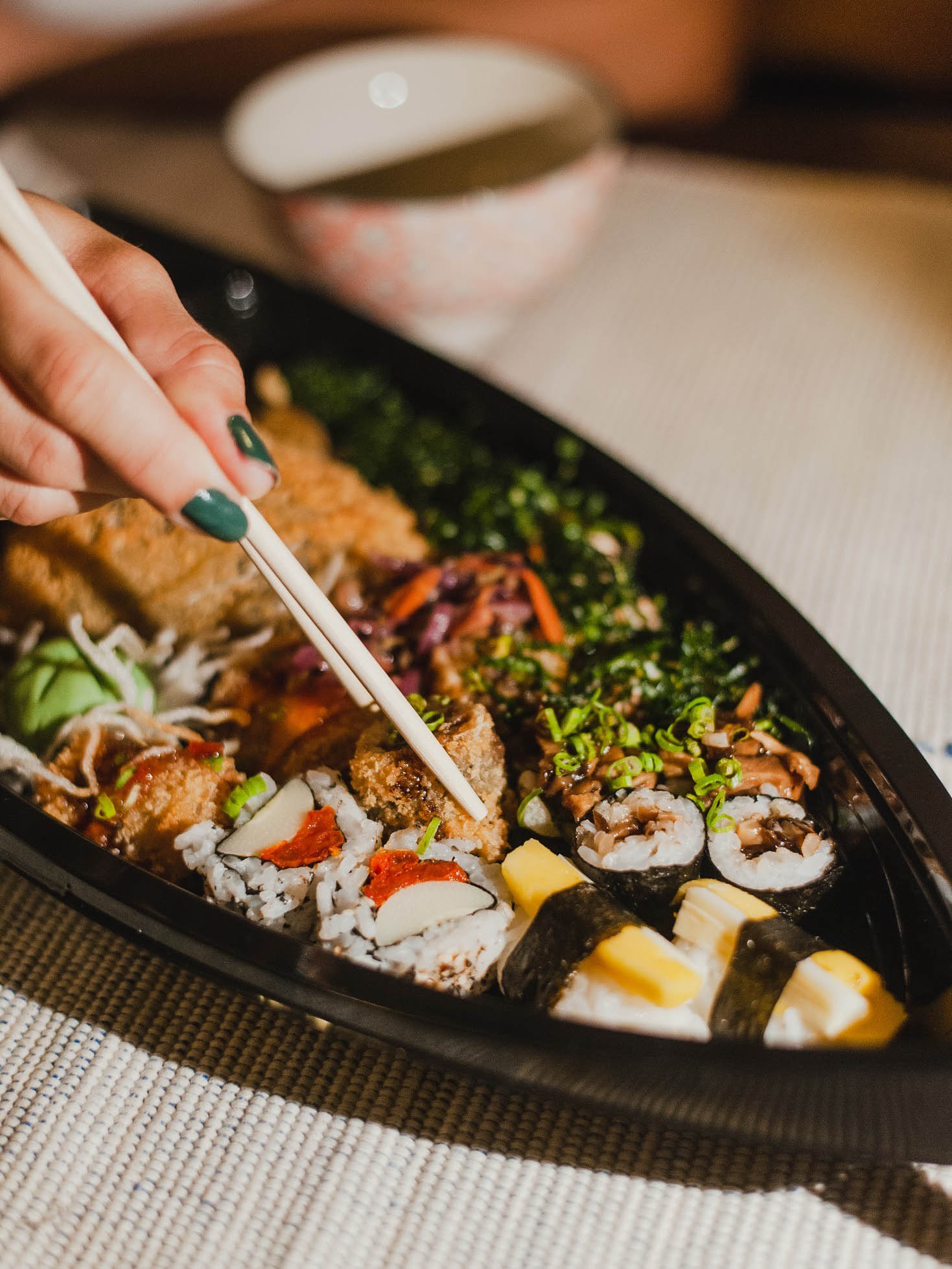 O cardápio é extenso. São 15 entradas de vários tipos de peças disponíveis, 23 temakis, combinados tradicionais e especiais, duas opções kids e oito sobremesas. Cada seção tem pelo menos um prato vegano. O combinado vegan reúne ingredientes como batata doce, tomate seco, pepino, cogumelos e palmito.