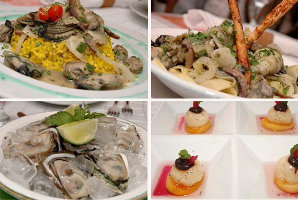 | No sentido anti-horário estão dispostos os seguintes pratos à base de ostras: com alcachofras, shiitake com manteiga de ervas com talharim; com alcachofras, shiitake com manteiga de ervas com arroz ao açafrão; in natura e, para finalizar, uma saborosa sobremesa batizada de ‘pérola do mar’ |