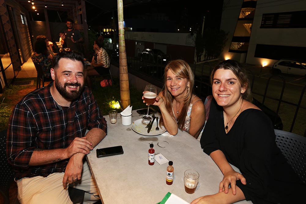 Chefs André Vieland e Deborah Sá e o empresário Marcelo Pê