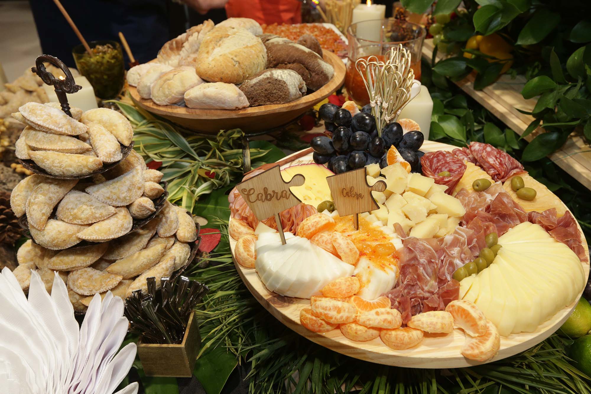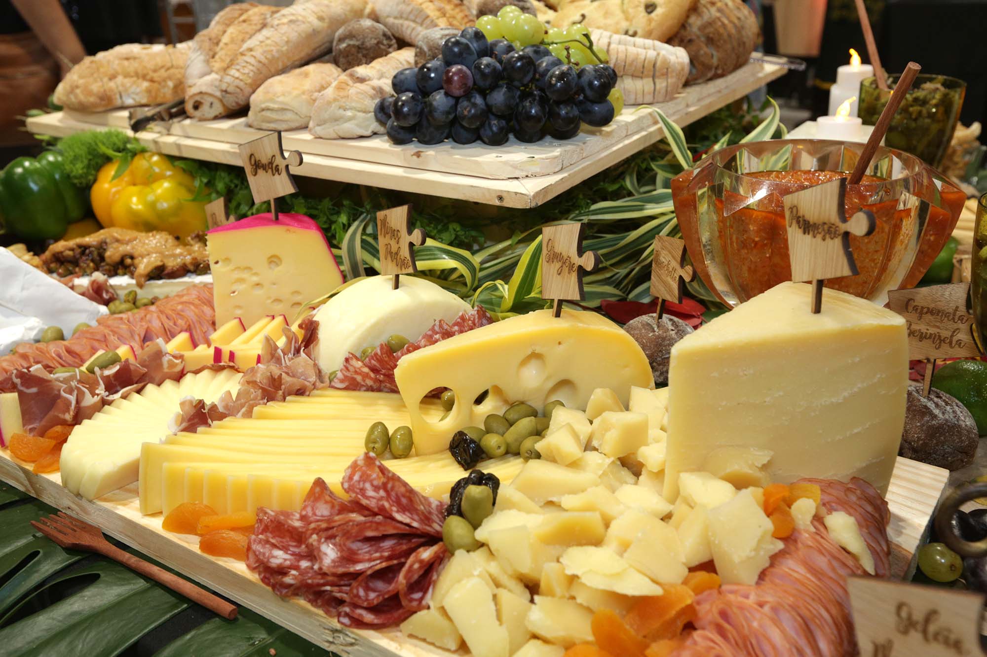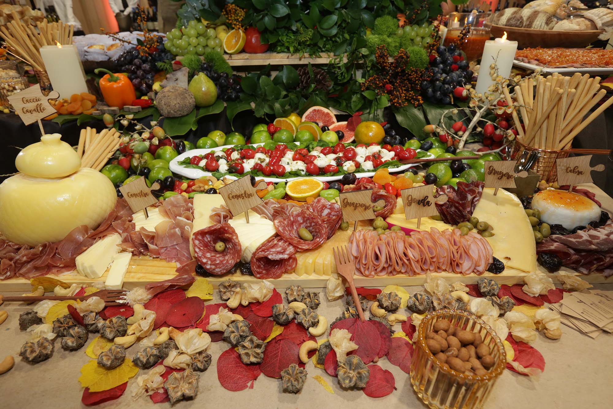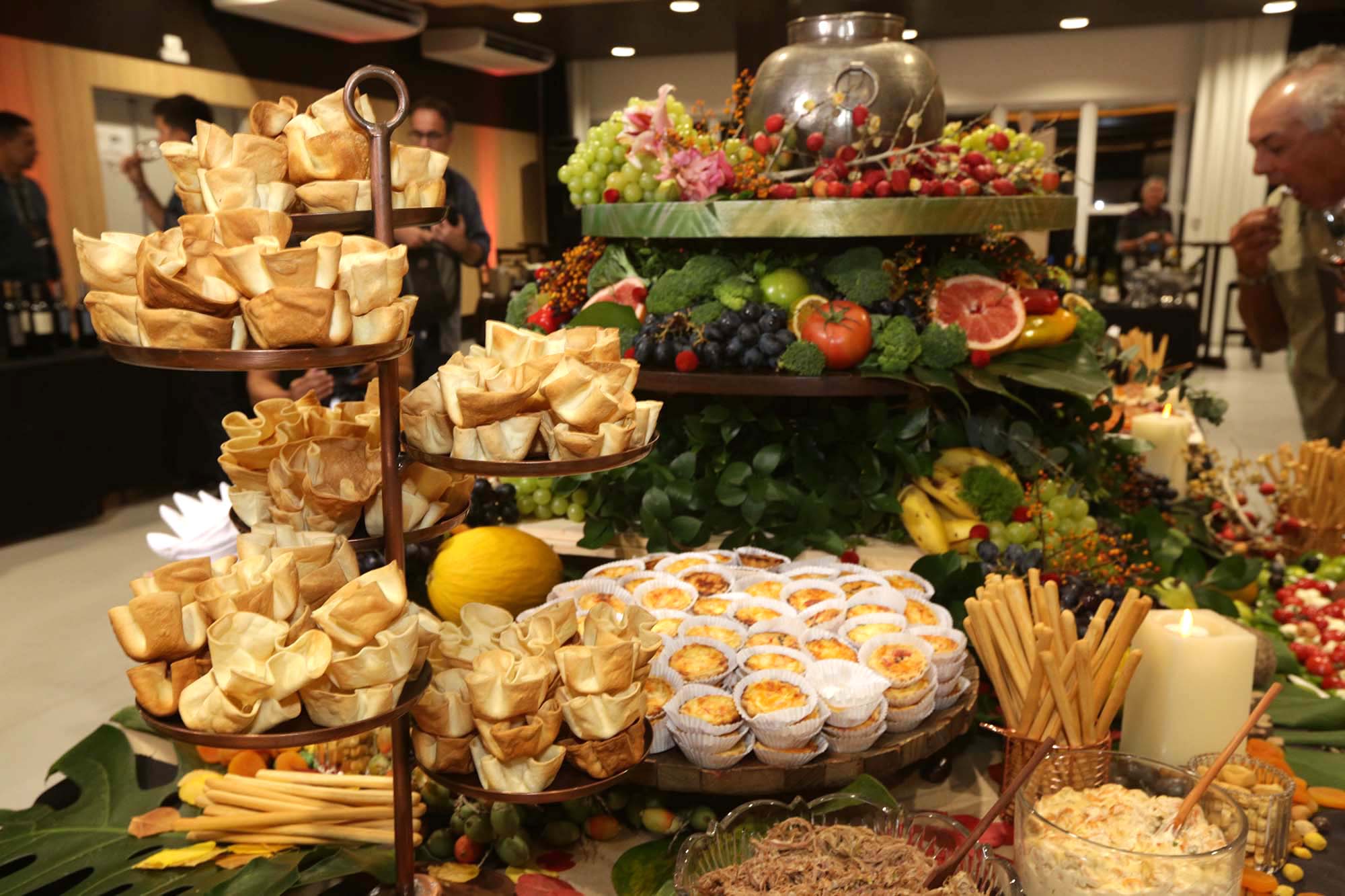 O buffet apresentou um arranjo de frutas e profusão de folhagens, com uma comida fria, prática e rápida. “Para a noite de hoje, investimos pesado nos queijos para acompanhar os vinhos, além dos canapés, rosbife, molho de bruschetta e as caponatas”, comentou Maria Antônia Fernandes, diretora da empresa. “Trabalhamos com a ideia de uma coisa prática, uma mão na taça, outra na comida que trouxemos”, arrematou.