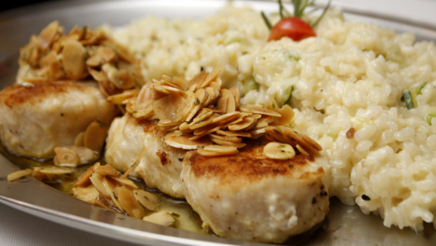 30 g de amêndoas salteadas na manteiga com salsinha e gotas de limão siciliano.