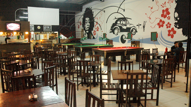 As tradicionais mesas de sinuca agora dividem espaço com o palco para as apresentações de bandas ao vivo