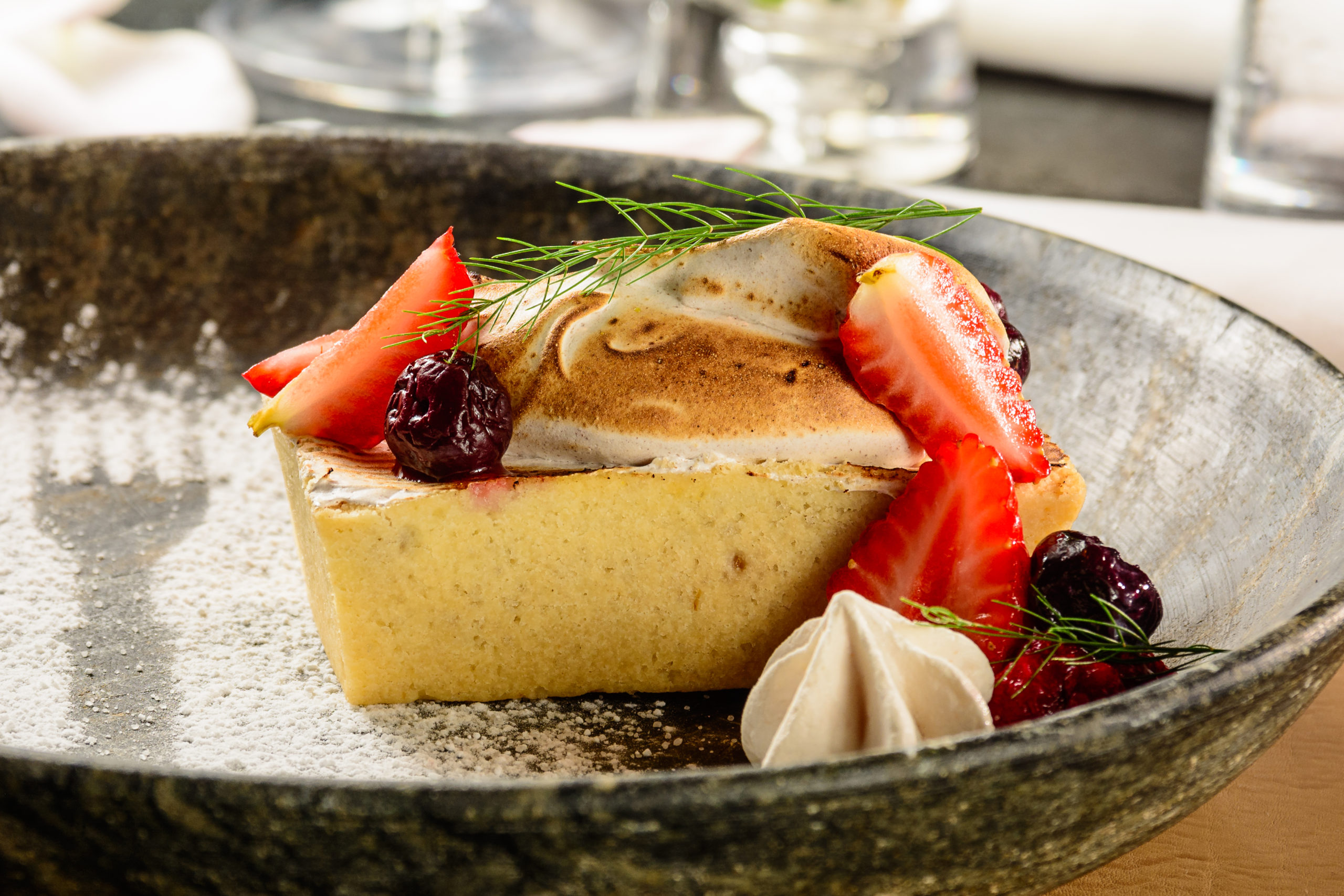 A carta de vinhos inclui três rótulos especialmente selecionados, entre os quais o elogiado Victoria Geisse Extra Brut Vintage.