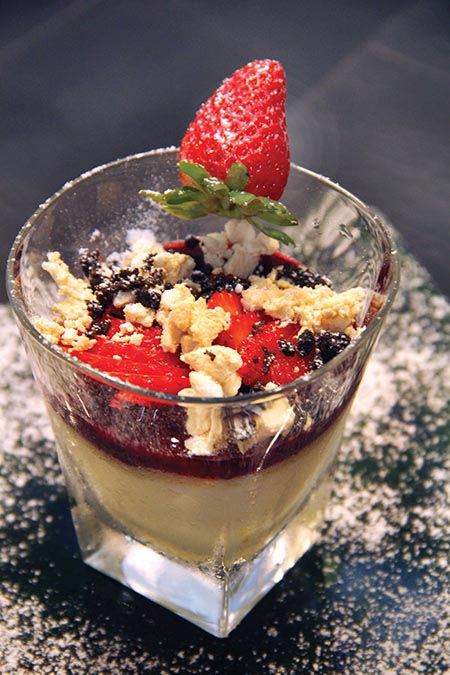 A nova sobremesa é um creme de limão com frutas vermelhas, crocante de chocolate e suspiros.