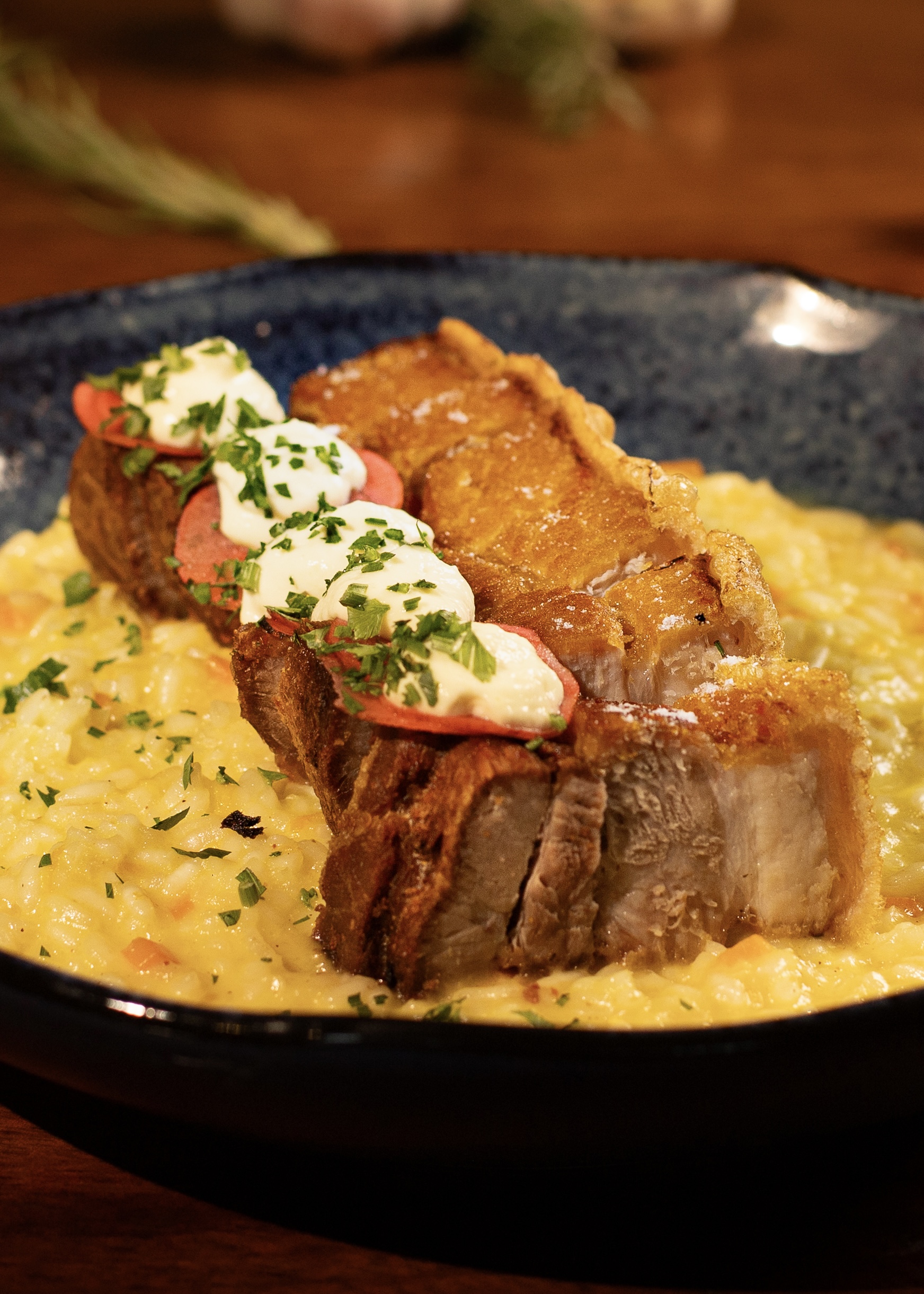 Das entradas, destaque para o Roll Choripan (pão folha caseiro recheado com massa de linguiça artesanal, queijos muçarela e parmesão, grelhado na chapa e servido com maionese de limão e chimichurri) e Chimi Roast Beef (roast beef tostado com crosta de chimichurri na brasa, servido frio com azeite defumado, maionese tapenade de azeitona e pão tostado).