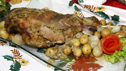 Retire o filme PVC e coloque as minibatatas e as minicebolas ao redor do pernil, aplique uma folha de papel alumínio, leve ao forno para assar a 170 graus até que o pernil esteja assado por completo. Sirva com fatias de abacaxi em conserva.