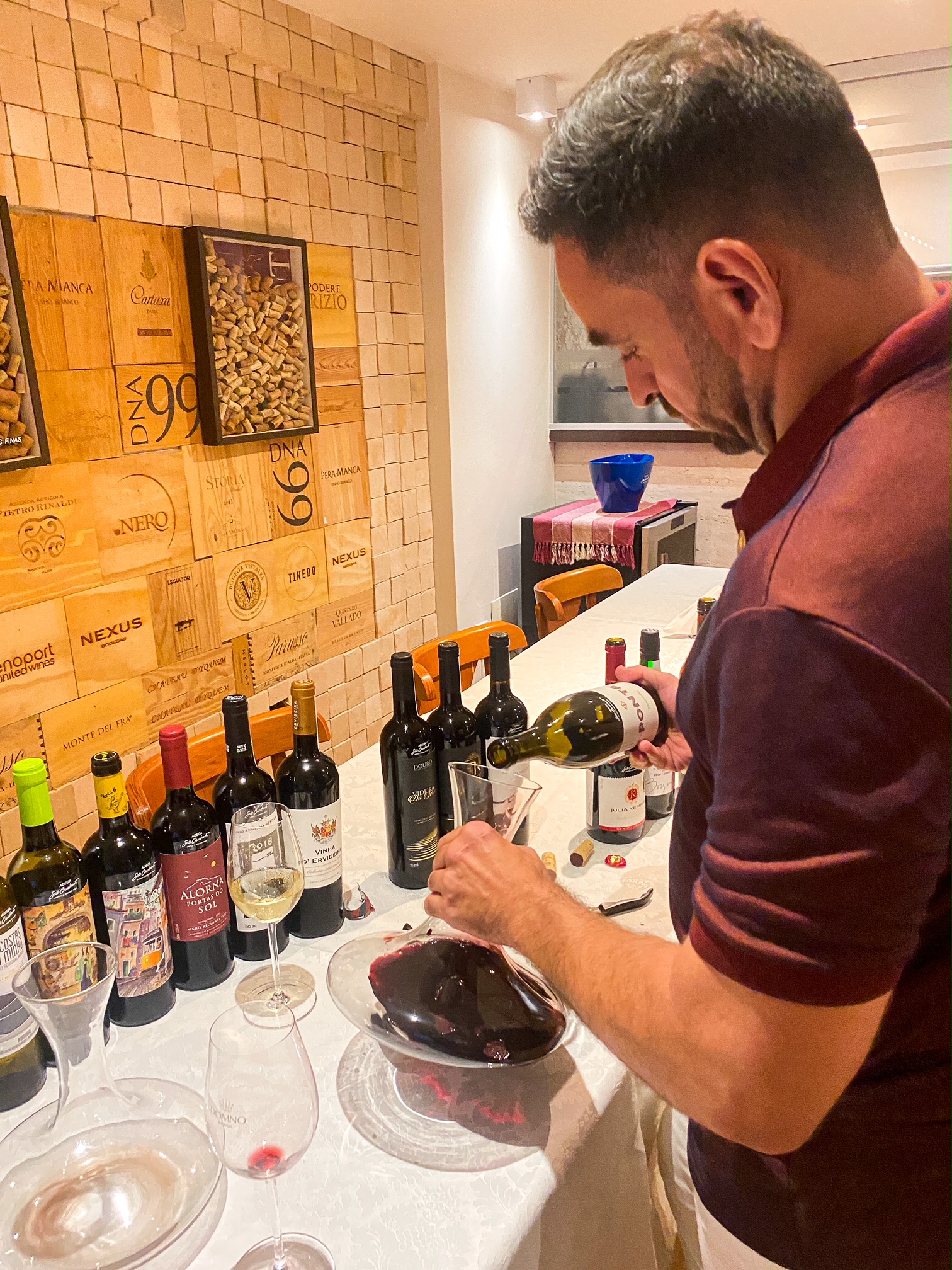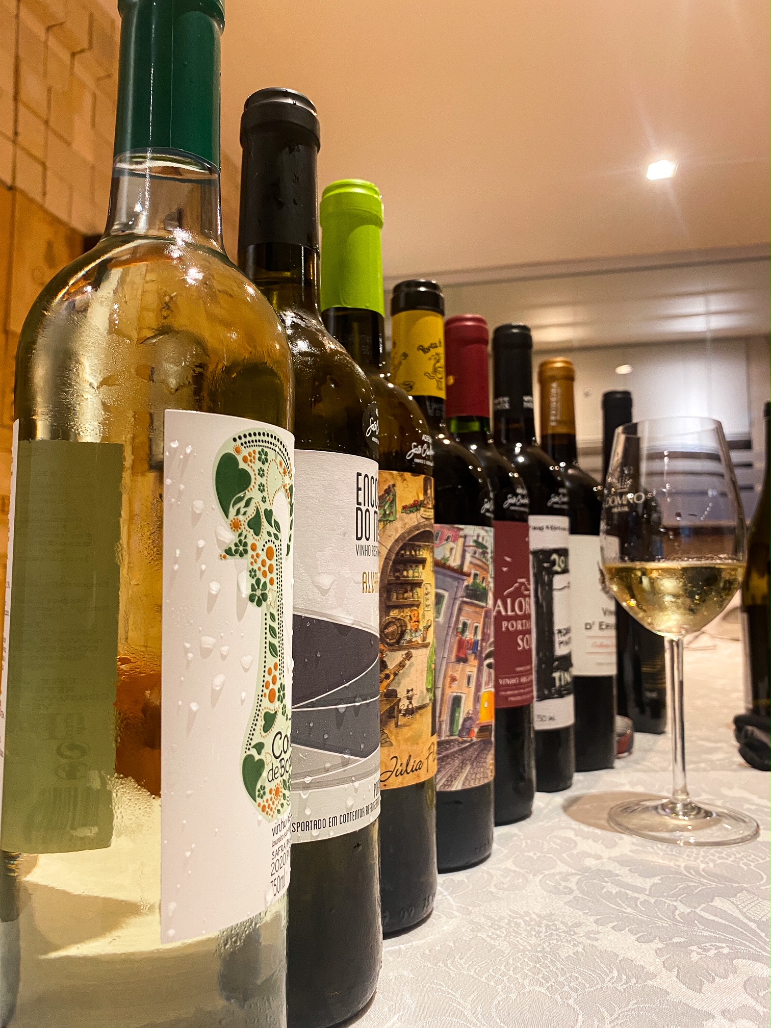 Entre os vinhos disponíveis, foram abertos um verde Alvarinho Encostas do Minho, o tinto Portas 6 Reserva, o tejano Portas do Sol, o destaque alentejano Ponte Mouchão, um Quinta da Romaneira Touriga, proveniente do Douro, um bairradense Da Pipa (100% Baga), um Julia Kemper do Dão e um HM Borges da Ilha da Madeira, bastante elogiado durante a sobremesa.