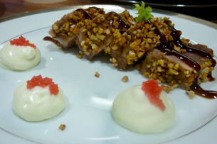 Atum selado com crosta de castanha de caju e molho de ostras e espuma de wassabi com caviar Frango marinado com crosta de gergelim sobre leito de cogumelos frescos salteados e molho de tamarindo