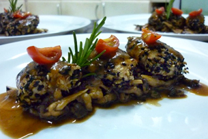 Filé com cogumelos trufados em duas texturas, queijo de cabra e tomate