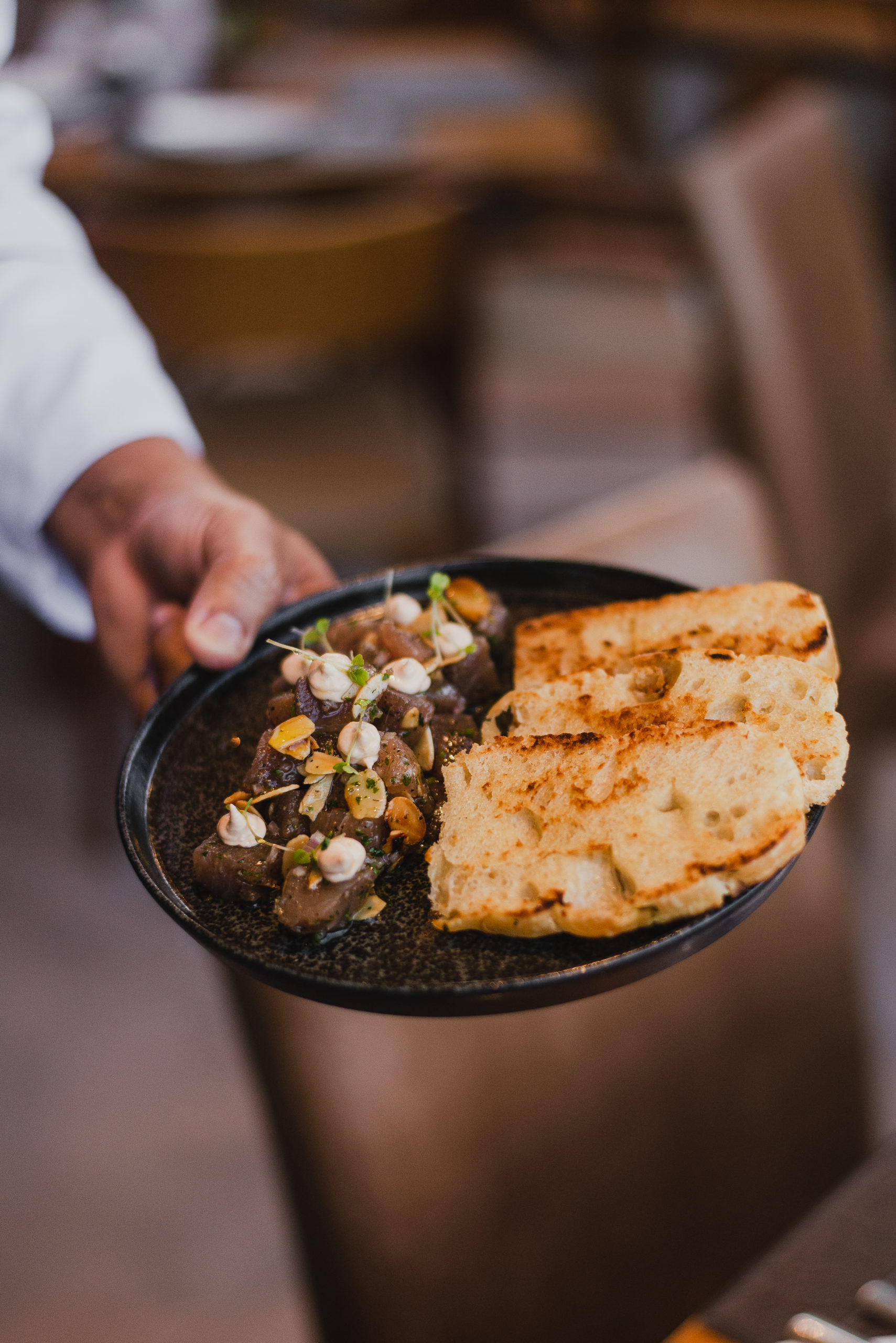 O crustáceo também é destaque no Camarão Crost, temperado com ervas e servido grelhado sobre um arroz socarrat (carmelizado e crocante), com finalização de azeite de alho negro e endro. Mas quem preferir pode optar pelo Risoto de Caranguejo, que acompanha camarões empanados e é servido com gotas de creme de queijo, farofa crocante e brotos de coentro.
