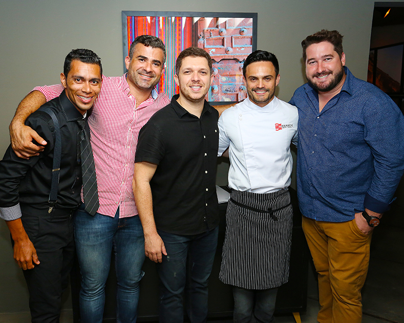| O mixologista do Hamachi, Márcio Felipe, os sócios Tiago Gadelha, Heitor Almeida e Felipe Fonseca (último à direita) e o chef-consultor Edu Rejala |