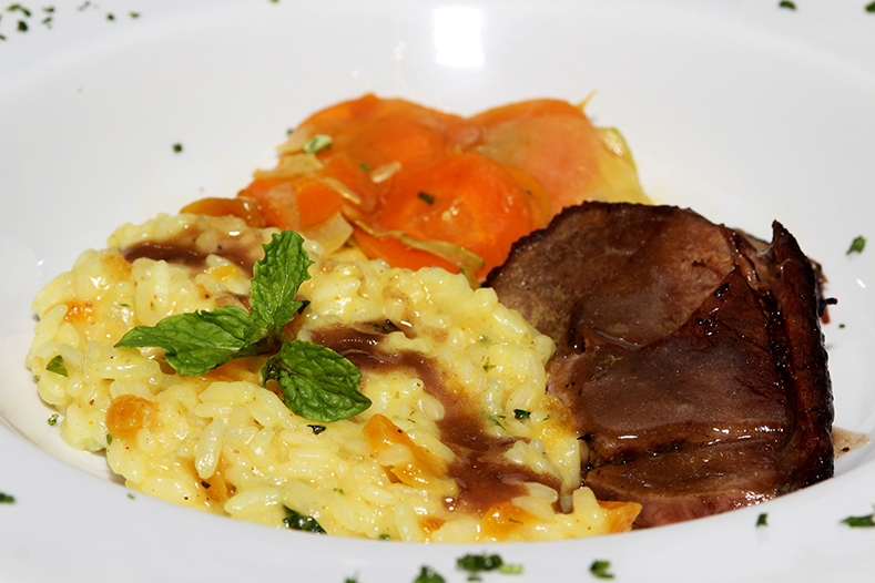 Pernil de cordeiro com risoto de açafrão, damasco e lâminas de legumes no vapor