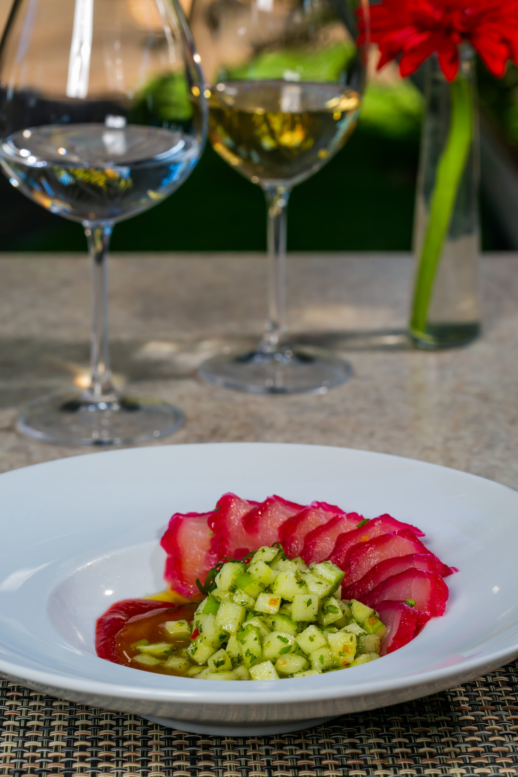 Uma das novidades é o Sashimi de robalo, servido de entrada. O peixe passa por um processo de cura no suco de beterraba, ao estilo gravlax, típico da Escandinávia. Acompanha vinagrete de maçã verde e purê de morango. Outra opção de entrada é o “Insuflado potiguar”: macaxeira insuflada com carne de sol, vinagrete e mousse de abacate.