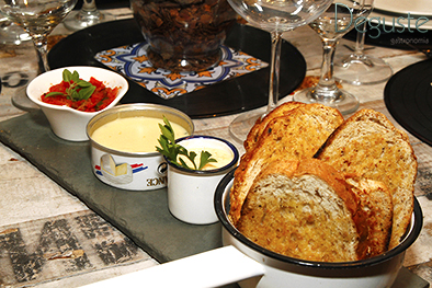 | Couvert (cesta de pães e torradas, pastas, molho de bruschetta e manteiga temperada) | Camarão Agreste (camarões à milanesa gratinados com queijo sobre molho de tomate, arroz com charque, cebola, coentro e batata doce palha) |