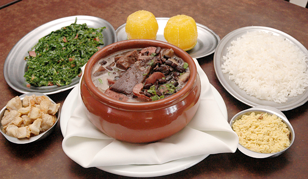 | Feijoada é acompanhada de arroz, couve, farofa de bacon e laranja |