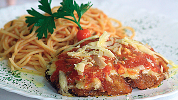 | Filé a parmegiana com massa al sugo é uma das opções para o horário do almoço |
