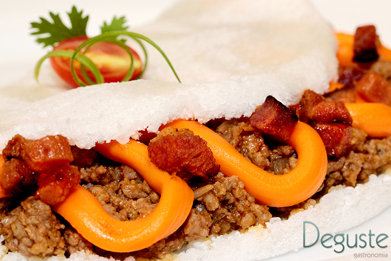 | Tapioca "Samara": recheio de carne moída picante, bacon e molho de queijo cheddar |