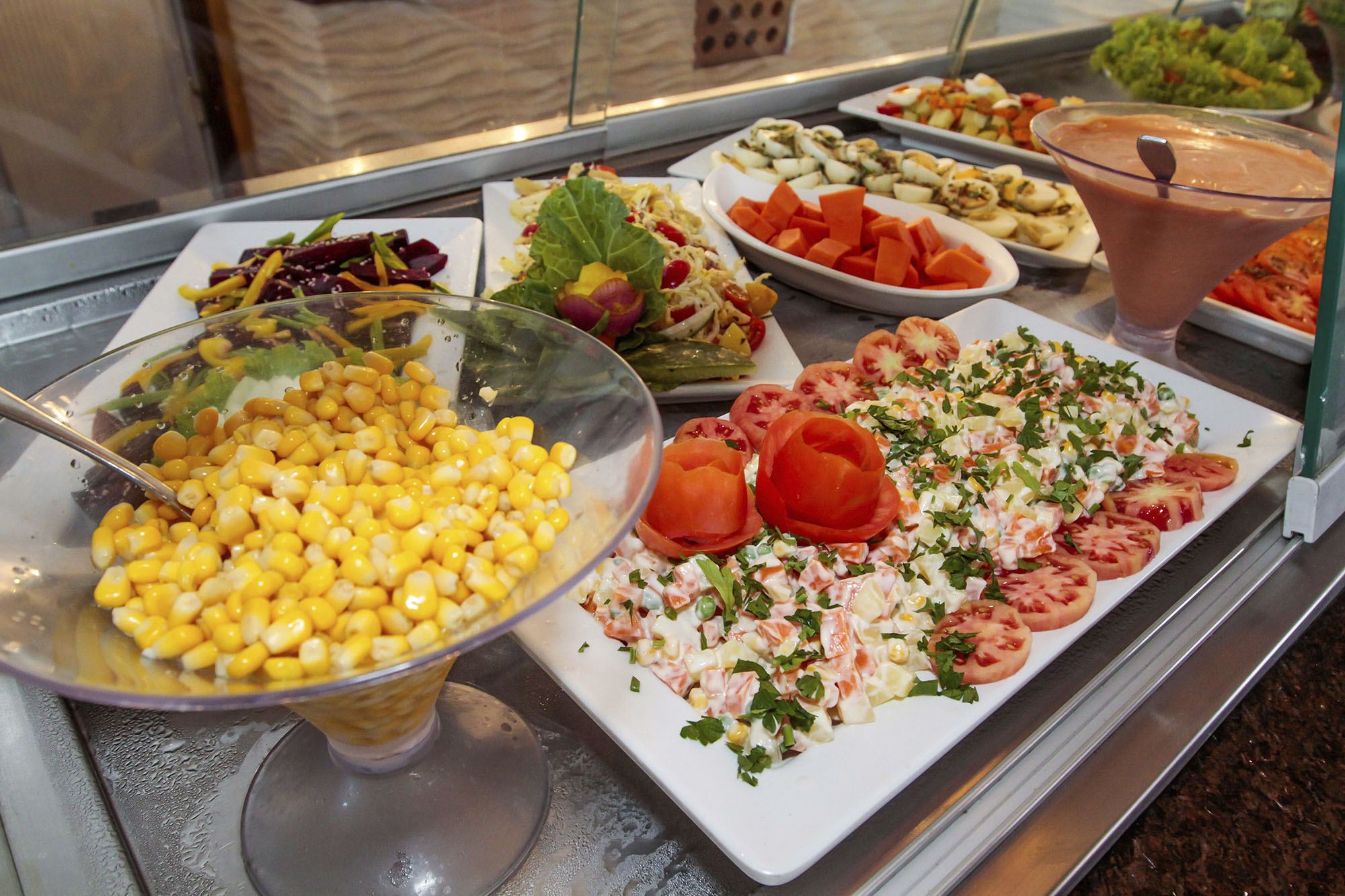 Diariamente, são quase 50 tipos de prato, com destaque para os frutos do mar, os grelhados e a culinária regional. A mesa ganhou uma nova apresentação e novos itens. Na parte de churrasco, por exemplo, estão sendo oferecidos novos cortes, bem como peixe na brasa. O serviço de bar, com cardápio à la carte de petiscos, drinks tropicais e vinhos, também foi melhorado.