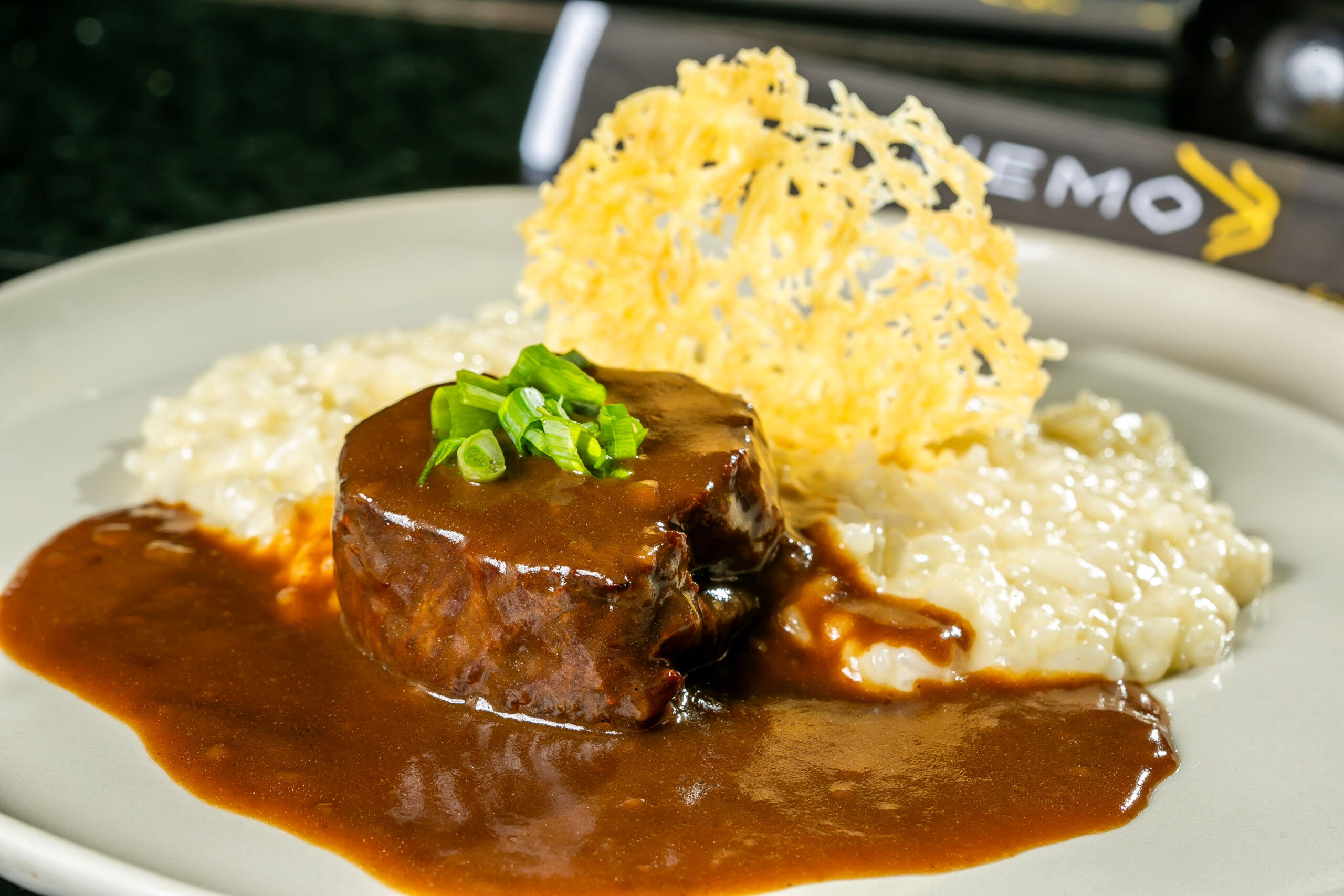 Filé mignon grelhado servido com risoto de parmesão e molho rôti
