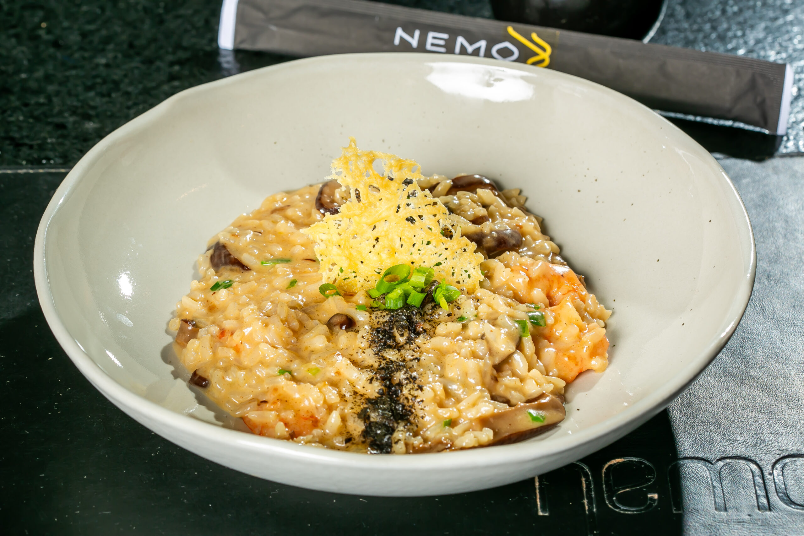 Risoto de camarão e shiitake, finalizado com manteiga trufada
