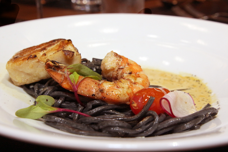 | Massa negra com creme de frutos do mar, peixe e camarões |
