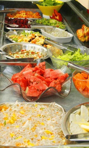 | 12 tipos de saladas e frutas são oferecidas diariamente |